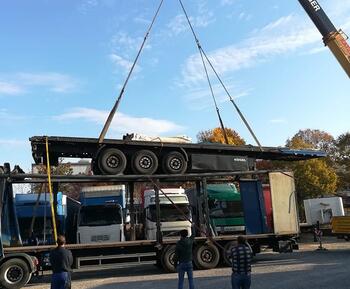 Der Auflieger wurde von einem Kran in einen anderen Auflieger aufgeladen um ihn abzutransportieren
