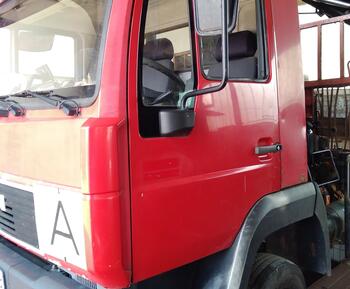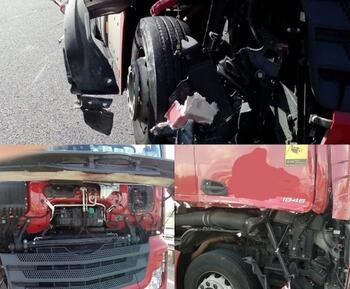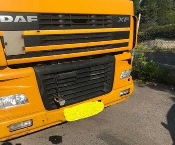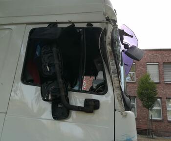 Der DAF ist an einen Baum gefahren und hat sich die Frontscheibe und die Seite ramponiert.