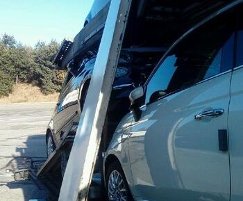 Der Autotransporter wurde angefahren und die obere Etage ist aus der Halterung abgerissen.