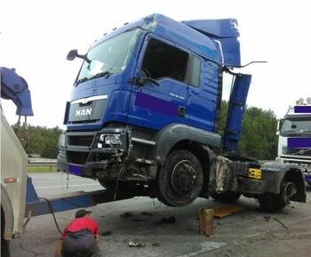 Riding along the A8 Autobahn towards the city of Munich, the Scania R 440 truck broke the front right wheel. The driver emergency braked and decided to inspect the car. After the inspection, it became clear that as a result of a collision with a f