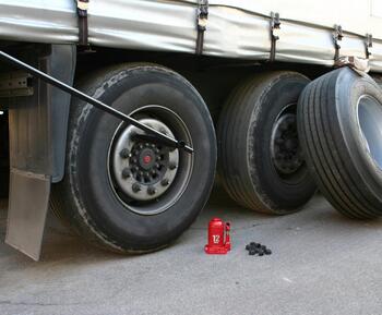 Tire fitting of a Schmitz-Cargobul semi-trailer of a Mercedes Benz Actros truck in Hamburg, Germany.